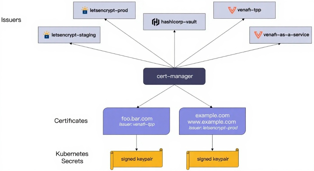 支持多供应商:Cert-Manager 支持从多个证书颁发机构申请证书,包括但不限于 Let's Encrypt、HashiCorp Vault、Venafi 等
