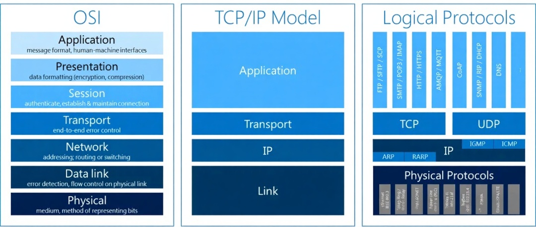 TCP/IP 四层模型:该模型由 OSI 七层模型演化而来,实际上并不是单指 TCP 和 IP 协议,而是一个协议簇,包含了 IP、TCP、UDP、FTP、SMTP 等多种协议。
