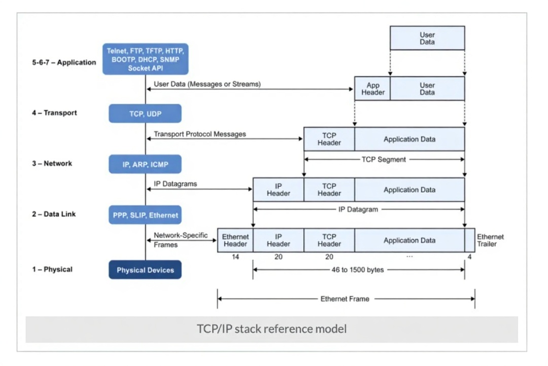 在发送数据时,TCP/IP 堆栈的每一层都会添加自己的报文头,包含该层需要的控制/元数据,以便在数据包穿过网络时对其进行处理,并将生成的数据包传递到堆栈的下一层,最终产生一个完整的网络数据包。数据包在网络中传输,到达目的地后被重新组装成原始消息。